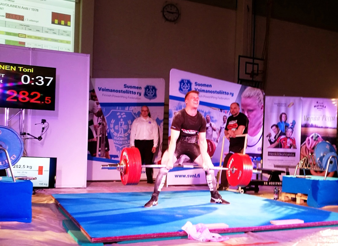 Toni Väisänen taisteli Suomenmestaruuteen avoimen luokan klassisen voimanoston SM-kilpailuissa Ylöjärvellä. Väisänen kilpaili painoluokassa alle 74kg, jättäen nyt taakseen painoluokkaa hallinneen moninkertaisen Suomenmestarin ja arvokisamitalistin, 2016 Euroopanmestari Sami Niemisen. Kilpailu näytti ennakkoasetelmissa kääntyvän Väisäsen ja Niemisen kaksinkampailuksi mestaruudesta. Jalkakyykyssä Väisänen rutisti viimeisellä nostollaan hurjan SE.n 240,5kg, vieden ennätyksen Niemiseltä. Penkissä meinasi tulla ongelmia koska helppo aloitusrauta 135kg hylättiin. Toisella nostolla se otettiin varman päälle, ja viimeiseen laitettiin yhteistuloksen kannalta varma 142,5kg.n rauta. Kyykyn ja penkin jälkeen Väisänen oli 17,5 kilon johtoasemissa. Maastanostossa toisella otetulla 280 kilolla varmisteltiin mestaruutta, ja pakotettiin Nieminen vetämään 297,5kiloa jolla hän veisi mestaruuden. Ja kun Nieminen ei saanut rautaa ylös ja niin Väisänen voitti SUOMENMESTARUUDEN. Väisänen teki huiman 663kg yhteistuloksen, joka ylittää sekä EM- (625kg), että MM- (645kg) tulosrajat helposti.